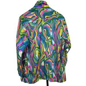 One-of-a-kind 1960s vintage Nortex Sportswear windbreaker jacket in an iconic psychedelic pop art print. Features bold swirling colors in pink, green, yellow, and blue. Designed with 4 flap pockets (snap closure), point collar, snap-up front and cuffs, and unique loop-button neckline for a keyhole effect. Lightweight, packable, unlined, windproof, with belt loops (no belt). Made in USA as advertised in LIFE Magazine. Nortex Sportswear psychedelic windbreaker was a vintage 1960s jacket that was advertised in Life Magazine. The jackets are now considered collectible pop art and are prized for their vibrant, colorful designs. A true mod-meets-art collectible.