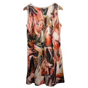 Psychedelic tank dress in wavey peach, brown, beige, tan, black, green, pink, orange, and white in a size large. Unique sleeveless knee length in a flattering A-line silhouette. Neutral cream trimmed v-neck and sleeve openings. Comfortable pullover with wide straps - perfect for bra straps - in stretchy, packable, easy care poly/elastane. Lightweight 60s-inspired colorful dress that takes your from desk to dinner, errands to going out, weekend parties to vacay time.
