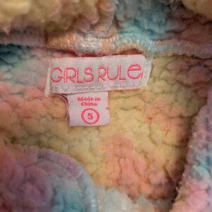 Super cozy and warm, with a fun pattern combining swirls of orangey-yellow, pink, and turquoise.