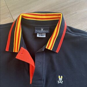 Black polo with bold red and yellow striped collar. Features Psycho Bunny logo on chest.