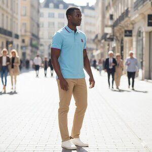 Psycho Bunny Sky blue polo featuring purple and hot pink trim. Iconic Psycho Bunny logo on chest. Show your confident side in this bold design Psycho Bunny polo. Pullover construction, luxury finishes and 100% Pima Cotton for all day comfort.