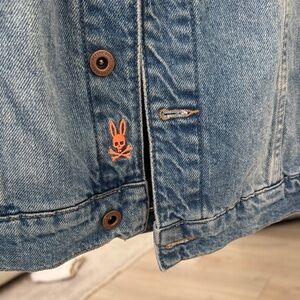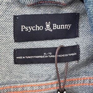 Stylish blue jean jacket by Psycho Bunny. Features button-down front and chest pockets. Ideal for casual outings.