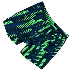 This is a pair of Psycho Bunny swim/board shorts in size S, featuring a geometric multicolor design in green, blue, and black. Made of 100% polyester with a polyamide lining, these shorts are machine washable and have an elastic waist with a drawstring for a comfortable fit. They also include a built-in brief, back pocket, and quick-dry technology, making them suitable for surfing and recreational activities.