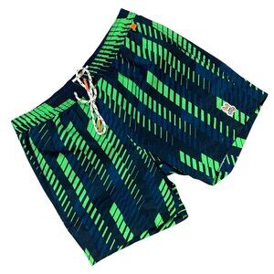 This is a pair of Psycho Bunny swim/board shorts in size S, featuring a geometric multicolor design in green, blue, and black. Made of 100% polyester with a polyamide lining, these shorts are machine washable and have an elastic waist with a drawstring for a comfortable fit. They also include a built-in brief, back pocket, and quick-dry technology, making them suitable for surfing and recreational activities.
