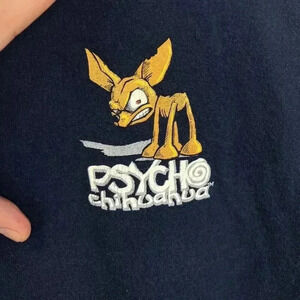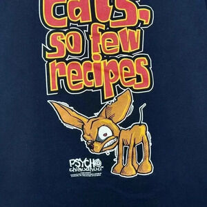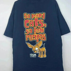 Get ready to make a statement with this eye-catching Psycho Chihuahua T-shirt! Featuring a playful and humorous graphic that reads 'So many cats, so few recipes' alongside a quirky Chihuahua design, this shirt is perfect for animal lovers and those with a sense of humor. Made from comfortable cotton material, it's suitable for casual wear or lounging at home. The navy blue color adds versatility to your wardrobe!