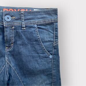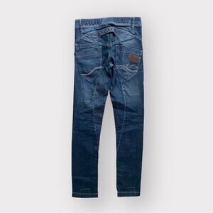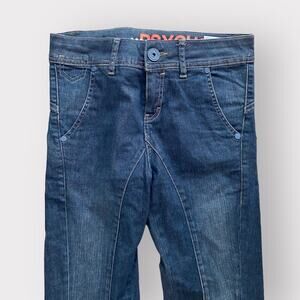 Crazy awesome pair of denim jeans. Tons of details and long crotch and slim fit. Really unique and flattering. Definitely one of a kind. Excellent worn condition in size 27 ( no stretch )