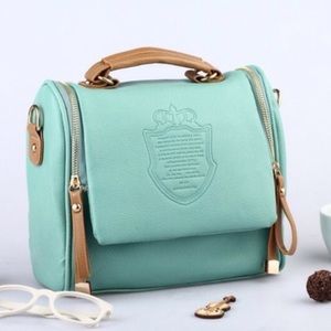 New. The strap is adjustable and removable. Available in mint green and navy colors. faux leather. the zipper pullers are green