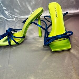 Step into style with these Public Desire heels, showcasing a bold blue and green color combination. The square-toe design and open back offer a modern twist, while the bow detail adds a touch of elegance. Perfect for making a statement, these medium-height heels are both fashionable and versatile.