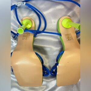 Public Desire Blue and Green Heeled Sandals with Square-Toe Design