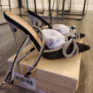 Pointed toe heels with straps covered in rhinestones with a bow decal.