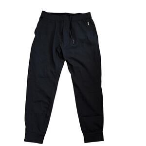 Men’s Public Rec jogger pants in black. Comfortable stretch performance fabric with elastic drawstring waist and zip pocket detail. Tapered leg with cuffed ankles. Size 32x30. Perfect for athleisure, travel, or casual wear.