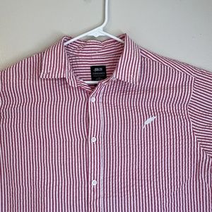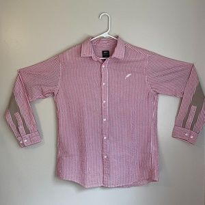 Publish red & white striped long sleeve button up shirt. Feather embroider on the left breast pocket area