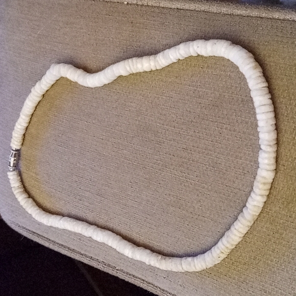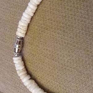 Puca shell choker in cream colors and has a silver twist on/off mechanism.