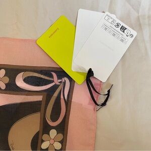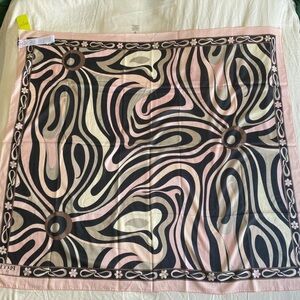 Stylish Pucci scarf with an abstract pattern. Features pink, black, and tan colors.