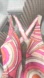 Vibrant one-piece swimsuit with a swirl pattern. Features shades of pink, orange, and cream.