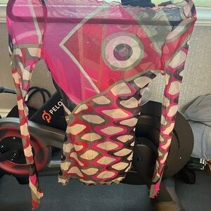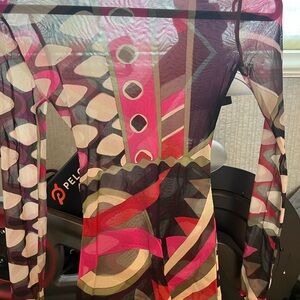 PUCCI top is printed with the vibrant 'Vivara' print - first introduced in 1965, it's inspired by the crescent shaped island in the Gulf of Naples. It's made from lightweight, semi-sheer chiffon for a slim fit and has lettuce edges tracing the boat neckline and hem. Worn 2x.