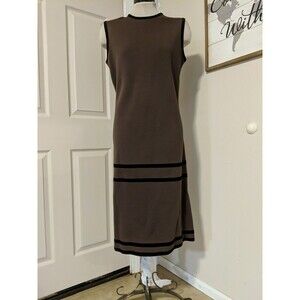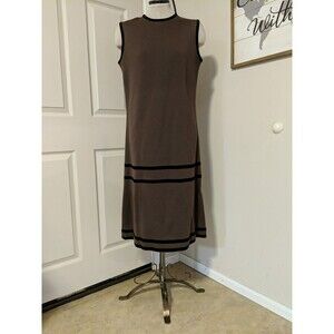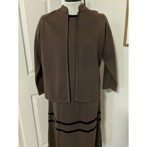 Puccini Brown Sweater Dress with black stripe border Jacket Vintage Cardigan Outfit Women Size 14 Large Tag says Made in the British Crown Colony of Hong Kong which should date this outfit to the 1960's or 70's Open front cardigan and back zip dress Very Good Condition