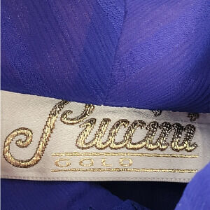 Elevate your vintage collection with this exquisite Puccini blouse featuring gold and electric blue sheer stripes. The high neck and long balloon sleeves exude sophistication, while the invisible button front adds a touch of elegance. Perfect for pairing with tailored trousers or a sleek skirt, this blouse is sure to make a statement at any event.
