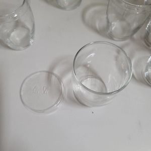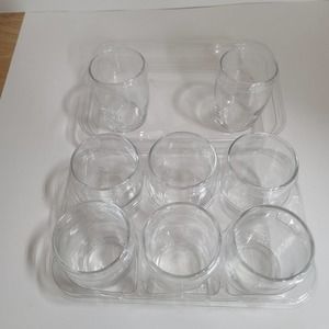 Pudding desert or drinkware glass set. 6 with plastic storage/carrying container and 2 extra. All 8 have a plastic lid.