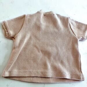 Organic cotton two-piece neutral summer outfit. Ribbed top and bottom with lace detail. The lace on the bloomers goes all the way around. Dusty pink. Size 6-9 months (68). European children's boutique brand. Rare and unique