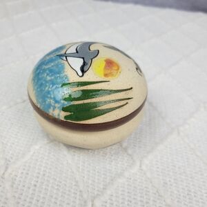 This beautiful hand-painted pottery trinket dish from Mexico is a unique addition to any collection. The multicolor design features a dolphin gazing theme and is made of clay with a glossy finish. The antique style and art deco design make it a stunning piece that is sure to impress.