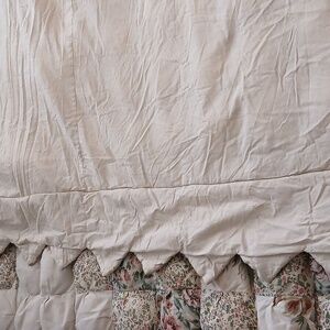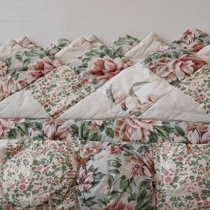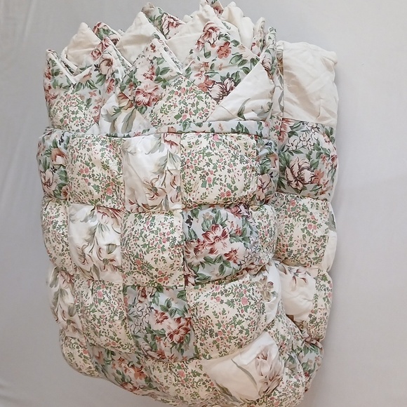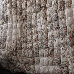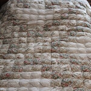 Stunning homemade patchwork puffy quilt in fantastic condition. Pretty colors of green, cream, light blue, tan and pink. Really neat puff quilt/biscuit quilt design and the different floral prints are beautiful. Measures 96 x 86 inches, pictured on a queen bed but could possibly used on a king. Cotton material and it is mid weight. Just gorgeous ❤️ Check out my other listings to bundle and save!:)