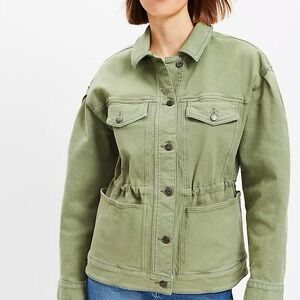 NWT Petite XXS and XS olive green jacket from LOFT. This structured woven denim jacket cuts quite the modern shape with blouson sleeves and a cinched waist. Point collar. Button front. Dropped shoulders. Long sleeves with button cuffs. Front button flap pockets. Internal drawstring waist.