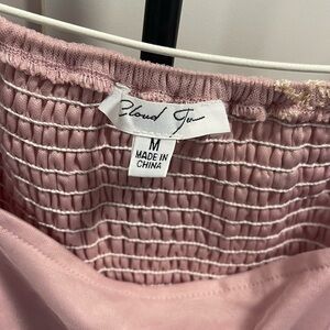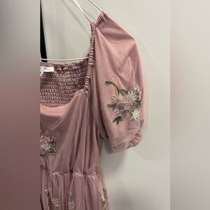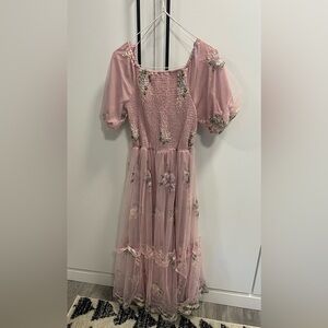 Puff Sleeve Pink Mesh Floral Embroidered Midi Dress