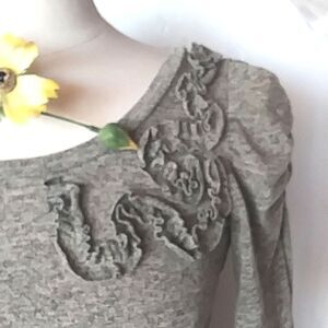 Stretchy beige-green scoop neck jersey blouse with gathered puffed sleeves and ruffled ribbon ish detailing near the left shoulder. Women's size small. Bought new but never wore. Great for the office or other dress casual occasions. In excellent pre-owned condition with no flaws.