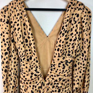 Gorgeous puff sleeve leopard printed silk mini dress. Love the play on the fitted and looser sections that compliment the body perfectly. Great ruffle detail at hem and v neck cut at top. Back zipper closure hugs you in! *Some minor flaws shown in close up pic with a couple runs in the fabric. Overall great condition. NWT.