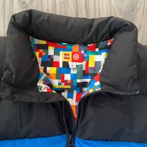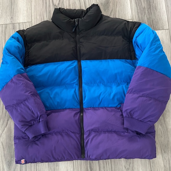Black and purple reversible puffer jacket with 2 pockets and a hood #reversible #pufferjacket