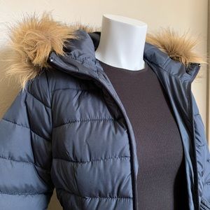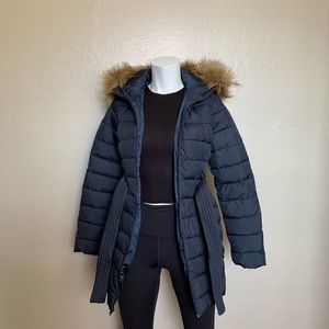 Navy color fur collar puffer jacket. Has a waist tie and zipper closure. Size x-small. Retail price $180. Parka. Winter coat.