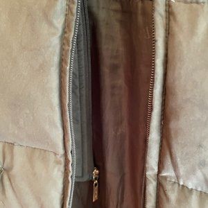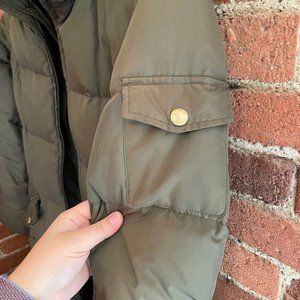 GUC - worn and loved but no longer fits. Olive green, knee length, double insulated. A lot of pockets (inside and outside) and zipper details. Has belt loops! Very warm and comfortable.