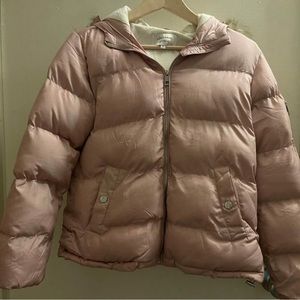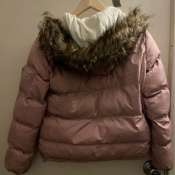 Rose gold colored puff jacket with hooded fur. Only worn once. Size small in women’s.