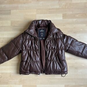 Brown faux leather puffer jacket from Hollister, featuring a smooth, leather-look finish and a cozy padded design. Full zip closure, high collar, and side pockets. Cropped fit with an adjustable drawstring at the hem for a customizable look.
