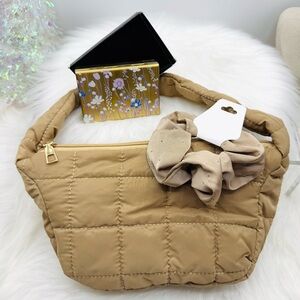 Puffer Quilted Nylon Material Hand Bag in tan with card case wallet Bundle
