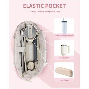 Designed with an inner elastic pocket to perfectly fit for 40oz tumbler with handle. Keep your tumbler secure and easily accessible, whether you’re traveling, working out, or running errands. No more taking up extra space in your tote—stay hydrated with ease!