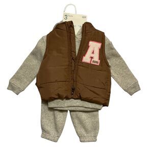 Keep your little one cozy and stylish with this adorable 3-piece Aéropostale Kids outfit, size 12 months. The set includes: Brown quilted puffer vest with front zipper and letter A logo patch; Gray fleece hoodie with A87 logo detail and long sleeves; Matching gray jogger pants with side cargo pockets and elastic waistband. Perfect for fall and winter, this soft and comfy set offers warmth and easy layering for everyday wear. Great for outings, daycare, or casual playtime.