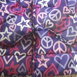 Purple and pink girls puffer jacket with hearts, stars, and peace signs. Pink fleece lining. 100% polyester. Stains on front and on sleeves.