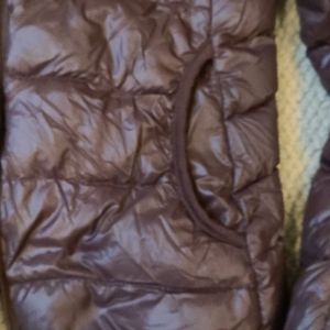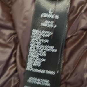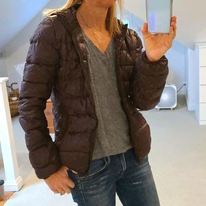 Ultra lightweight and warm! Interior hidden pockets. Hood. Brownish with hint of purple. Runs small.