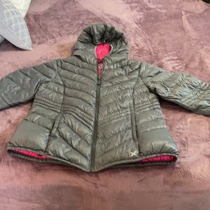 Grey and pink puffer jacket. Great for teenage girl ! Light and can take anywhere