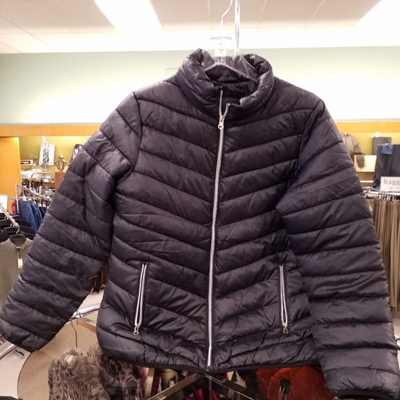 Super light weight puffer jacket. Mitered quilt pattern for flattering look. Bright silver zippers on front and on front pockets. 100% polyester shell, lining and fill. Machine wash and tumble dry. Fitted.