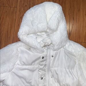 White puffer jacket. This zip up has a zipper flap so it’s not visible. Also the detailing is both puffer jacket and fuzzy. ******there are two small stains on the zip up 1 is by the zipper flap it’s a little pen mark, 2 a small stain on the bottom right side of the sleeve******** size medium & is oversized