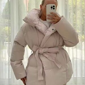 Puffer super warm jacket with belt, beige cute and stylish
