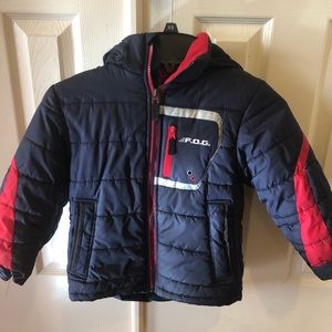 Detachable hood puffered jacket. Front and back highlights in red and silver. Fleece lined. Pockets on both sides.