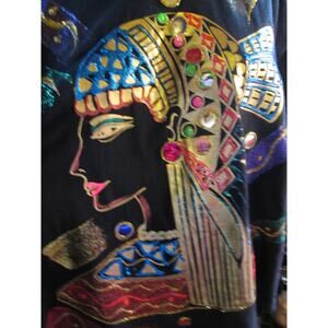 Eye catching puffy paint T-shirt with a large great Egyptian looking woman on the front, golds, reds and sparkles. It has been worn, is vintage, but I see no damage, t-shirt material is nice and soft, the label has been removed but what's left says 100% cotton. Shirt measures 24" pit to pit and is 27" long.