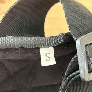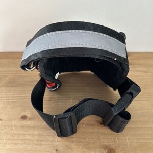 Sturdy and comfortable adjustable dog harness with hook & loop strap across the front and heavy-duty clip around the chest. This has a solid handle on the back help you lift your pup into the car or out of water, and three rings on the back for the leash. This one has a green and red tartan plaid and there is reflective tape on the chest strap.