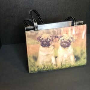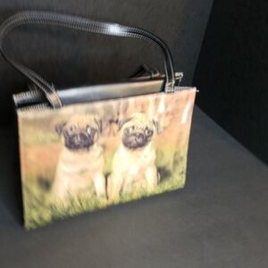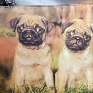 Adorable pug puppies on front with sequins on collars. Some sequins missing.