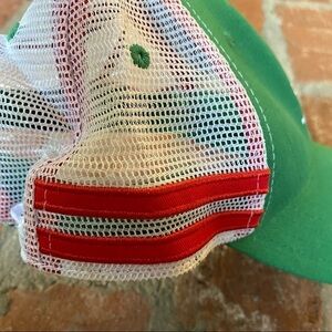 Pukka hat worn a few times. Green in front with 19 09 ⛳️ written on the front. White mesh in back with red stripes. Red Velcro adjustable strap in the back.