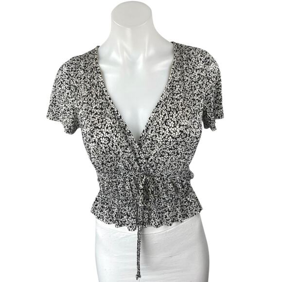 Pull & Bear Black White Floral Short Sleeve V Neck Peplum Blouse Top Size S